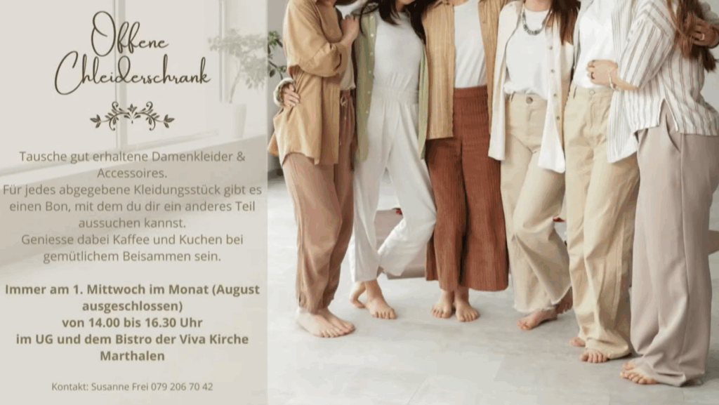 Tausche gut erhaltene Damenkleider und Accessoires und geniesse die Gemeinschaft mit anderen Frauen bei einem Kaffee. DOWNLOAD FLYER